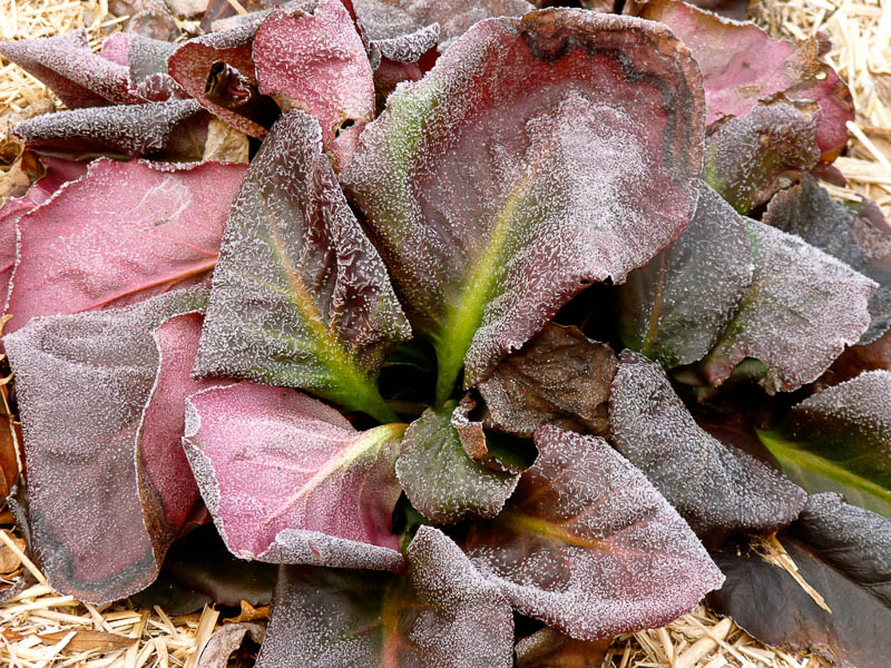 Badan (Bergenia) überwintert auf offenem Boden ohne Schutz, kann aber durch den Wind beschädigt werden. Um ein Austrocknen der Blätter zu verhindern, wird die Pflanze während der Kälteperiode gewässert.