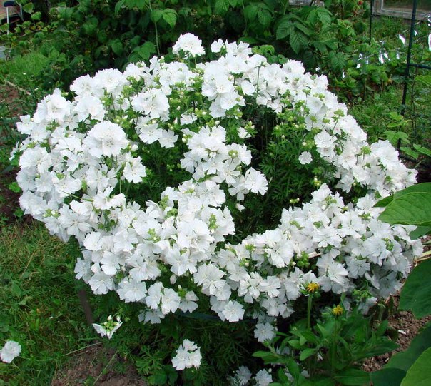 Moschusmalve wird oft zusammen mit Rittersporn gepflanzt. Weiße Blumenbeete werden aus der Malve der Braut hergestellt. Die Pflanze fühlt sich gut an mit Ringelblumen, Dahlien, Salbei. Wenn sie im selben Blumenbeet gepflanzt werden, erfreuen sich die Blüten an der Blüte bis zum Frost.