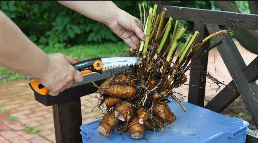 - Sie graben eine Spenderpflanze aus, zerlegen den Busch in Wurzeltriebe, schneiden alle unnötigen Äste und Spitzen ab.