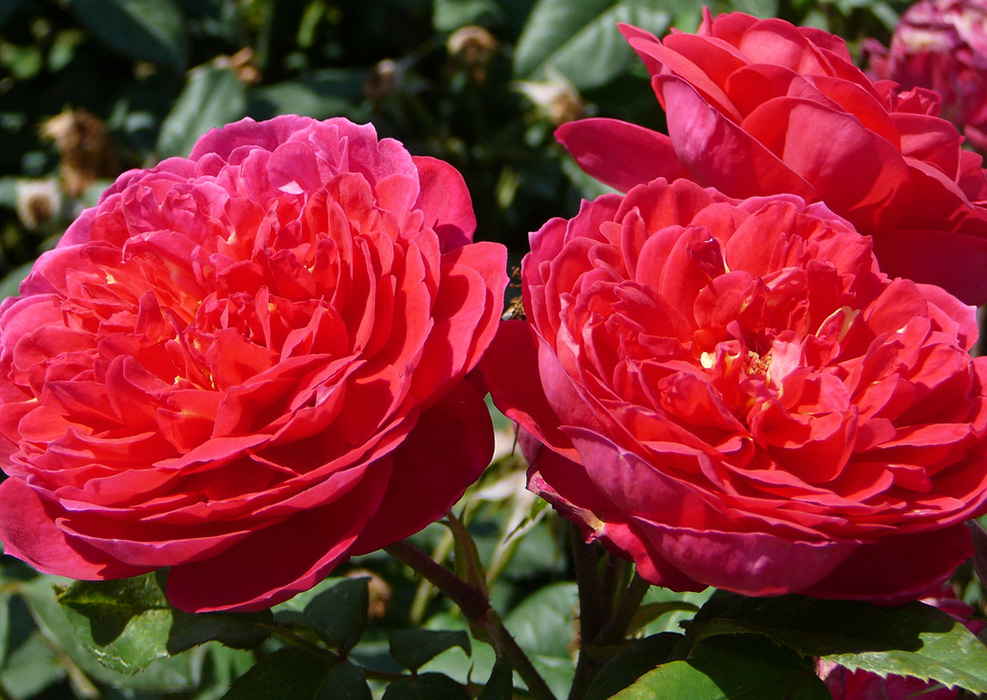 Während der gesamten Saison von Juni bis Oktober bilden sich Blumen. Sofort erscheinen neue Blüten in sehr großer Anzahl, um die verblassenden zu ersetzen. Lange Blüte. Der Farbton der Rose ist reichhaltig, am Anfang fast kirschfarben, und wenn sie vollständig aufgelöst ist, ist sie purpurrot, die hellste unter den englischen Rosen. Verblasst praktisch nicht und behält die Helligkeit und Intensität der Farbe während der gesamten Blütezeit bei. Nur bei intensiver, längerer Hitze können sie am Ende der Blüte ihre Farbe in Kirschrosa ändern.