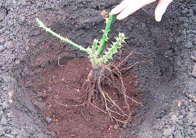 Während die Rose einweicht, wird der Boden an der bereits ausgewählten Pflanzstelle vorbereitet. Dazu müssen Sie ein 50 × 50 cm tiefes, 50 cm tiefes Loch graben und einen Eimer Wasser hineinschütten. Mischen Sie die oberste Bodenschicht mit Humus, Kompost, Sand und Asche. Sie können zwei kleine Handvoll Superphosphat hinzufügen.