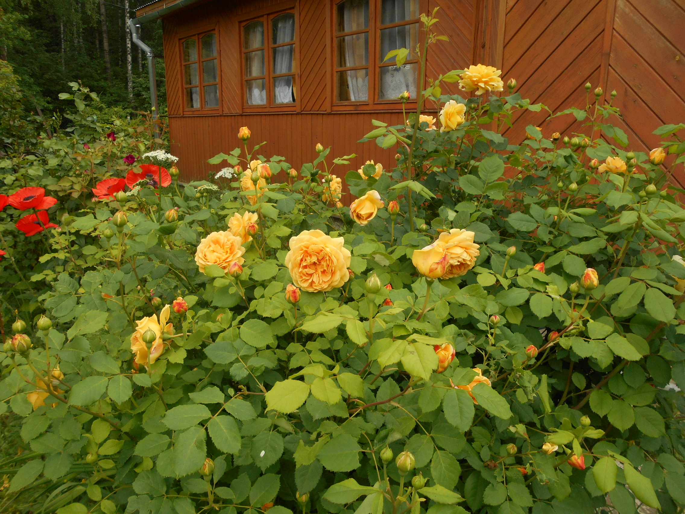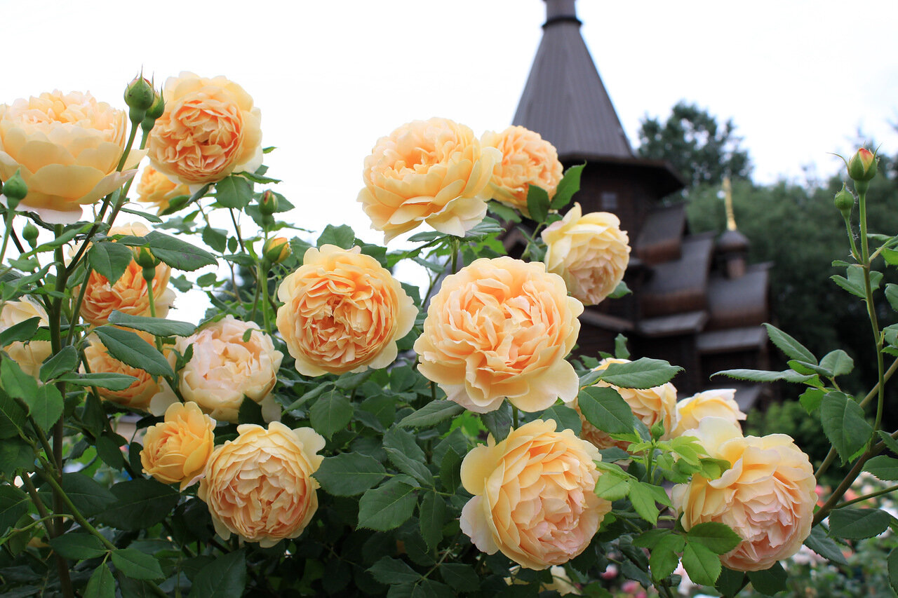 - πυκνά διπλασιασμένες ευαίσθητες ταξιανθίες ενός χαλκού-κίτρινου χρώματος - αυτό το χρώμα δεν είναι τυπικό για τα αγγλικά τριαντάφυλλα.