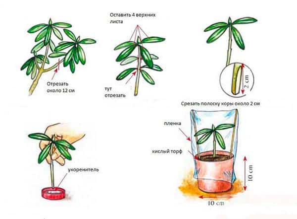 Cuttings are cut in early summer. Each branch up to 15 cm long is cut at an angle of 45 °, the lower leaves are removed, and the cuttings themselves are placed in a root formation stimulator for a day. After that, each shoot is planted in a fertile acidic substrate for rhododendrons and a greenhouse is made. Rooting will occur in about a month.