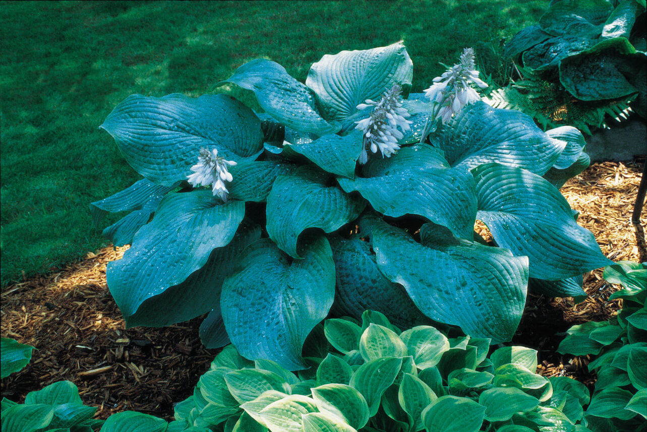 Hosta Big Daddy has a large, powerful leaf texture. Shrub height - up to 65 cm. This is one of the best species of blue host. Loves the shade, during flowering is covered with white flowers, the height of the peduncle is up to 100 cm.