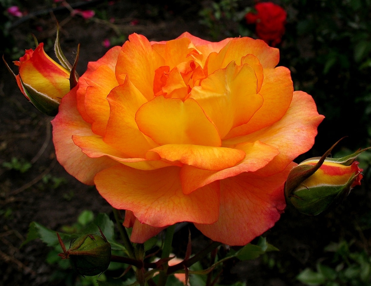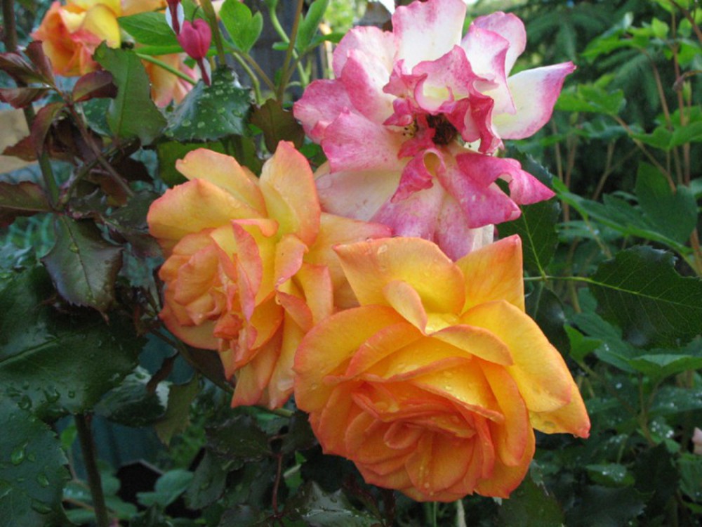 Rose shrub Sahara blooms with red and orange flowers and during this period it becomes a real decoration of the garden.