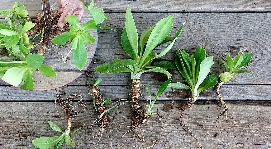 Para enraizar, las rosetas deben colocarse en las ranuras. Se requiere que el musgo sphagnum cortado se coloque en su parte inferior. Las raíces aparecerán muy rápidamente, en medio mes. Luego, el esqueje se planta en una maceta. Su diámetro no debe ser grande. La maceta se coloca en un invernadero frío durante la primavera. Además, se lleva a cabo un trasplante a un lugar permanente. Las rosetas plantadas en el suelo durante el período invernal están cubiertas de hojas.
