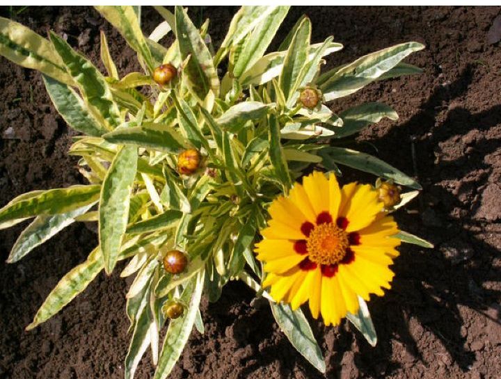 Nella coreopsis variegata, non solo i fiori, ma anche le foglie sono belli. È una varietà variegata derivata dal grandiflorum con fiori grandi e fogliame denso.