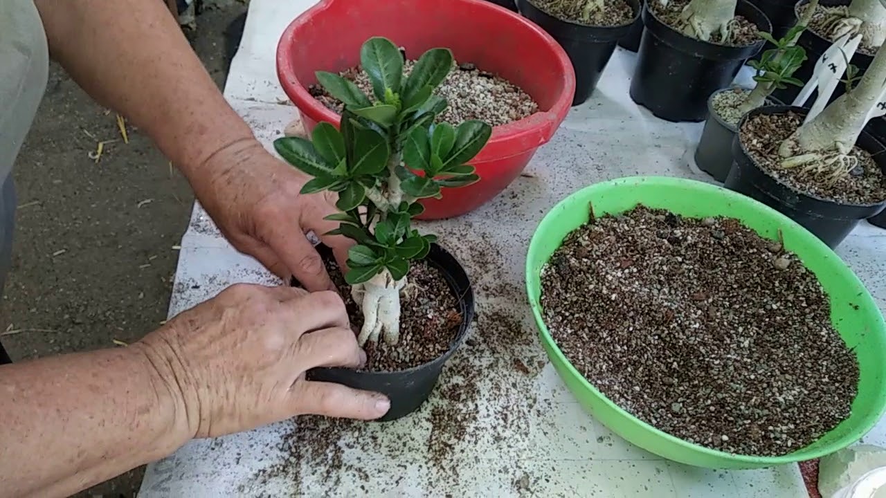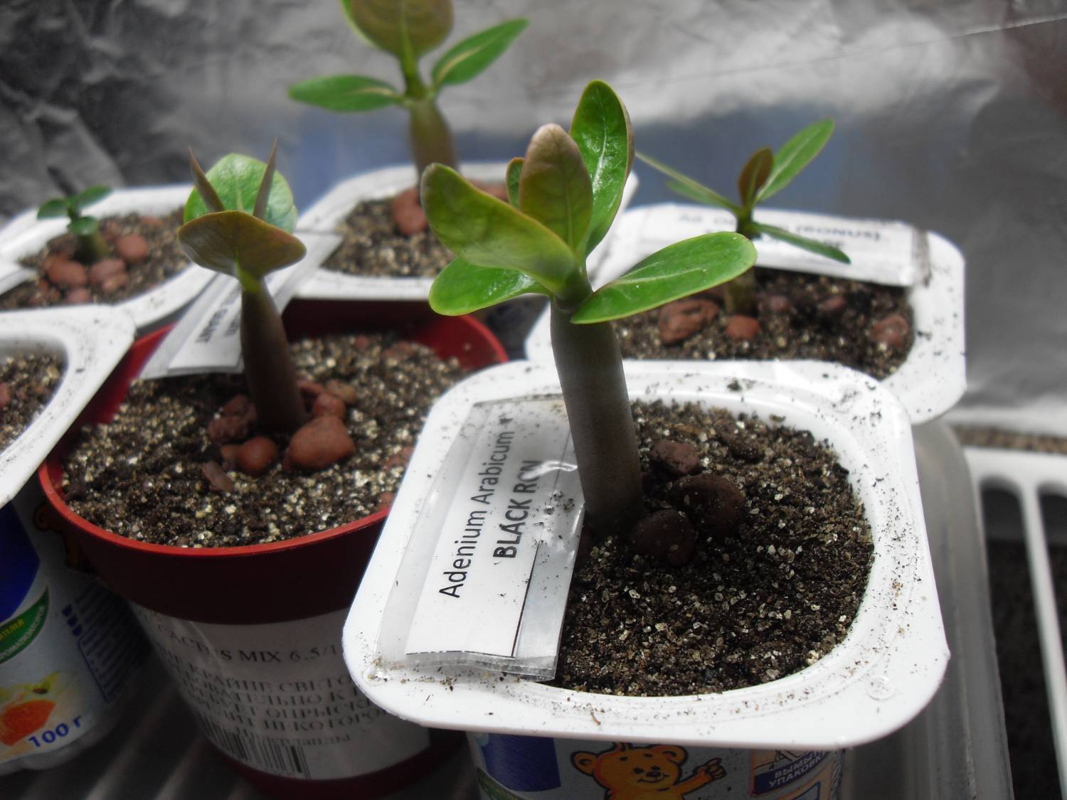 For utseendet til de første røttene plantes skuddene i en liten gryte med lett ventilert jord. Den beste sammensetningen for adenium er elvesand og kokosfiber blandet i like store mengder.