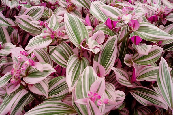 - bladene gleder seg med lyse striper av hvite, rosa og lilla nyanser. Andre har frynser på blader og blomster. Dette finnes i myke tradescantia;