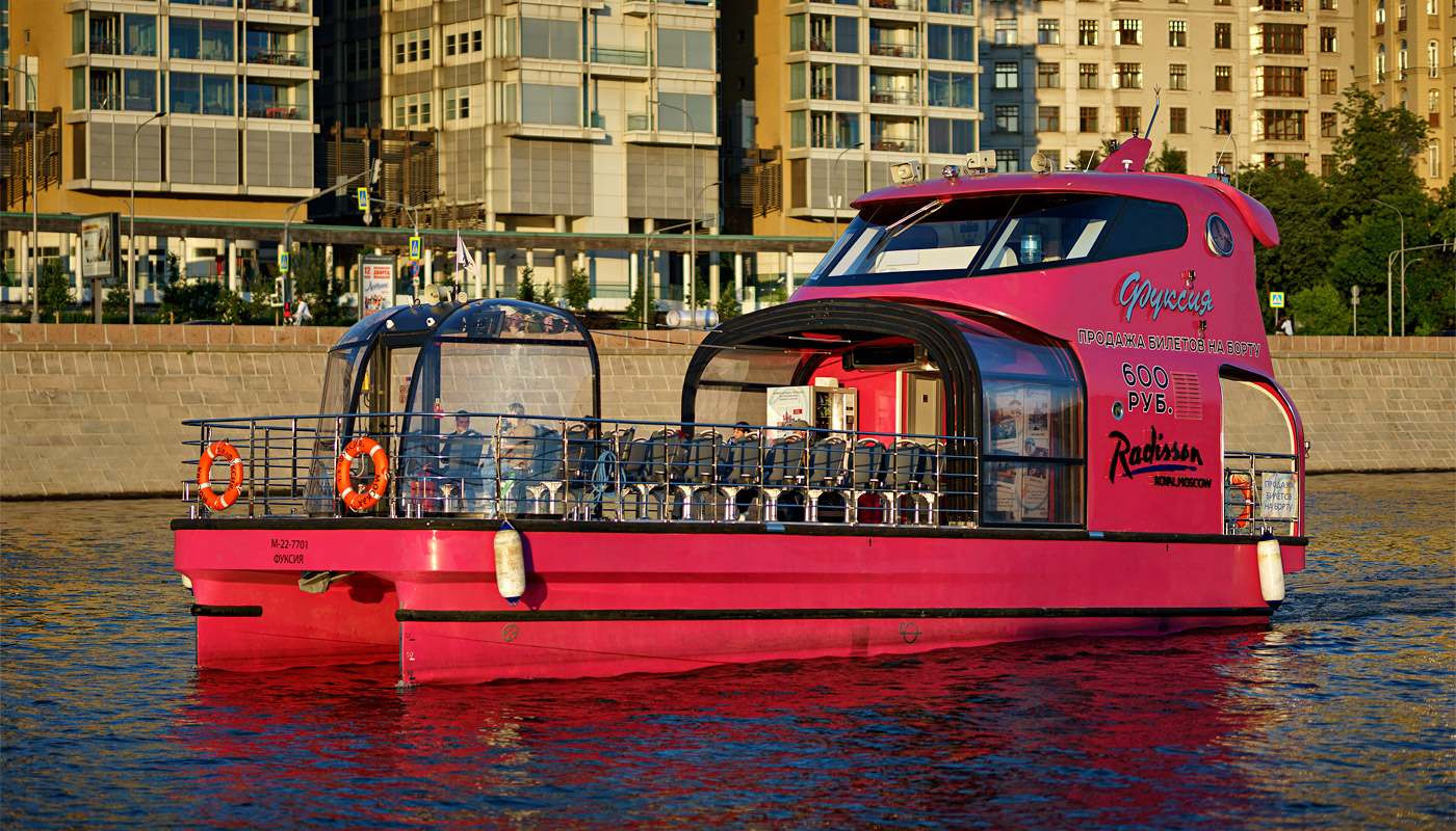 Ikke mindre "glamorøs" fornøyelseskatamaran "Fuchsia" løper langs Moskva-elven.