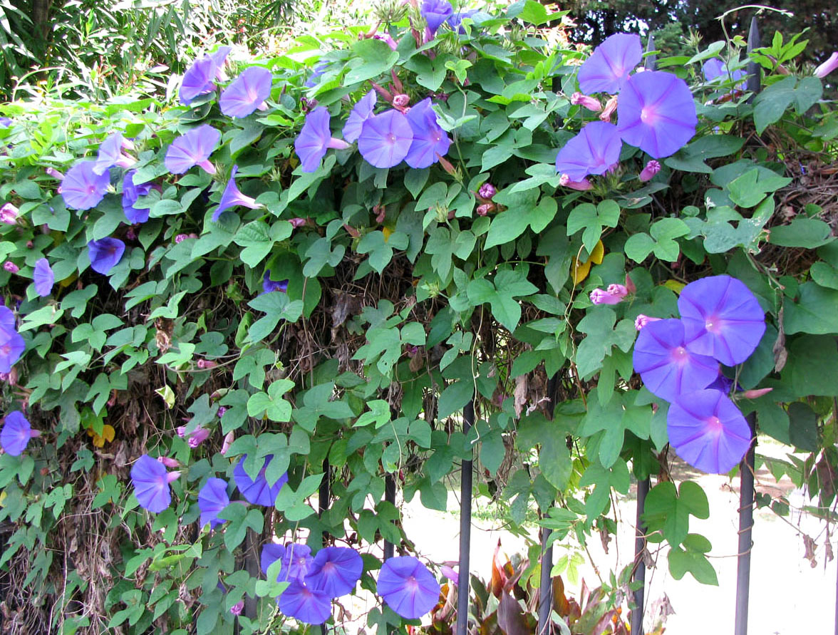 Ipomoea blue - liana opp til 5 m lang, gir mange laterale prosesser. Store blå og lilla blomster med en diameter på ca 10 cm samles i blomsterstander på 3-4 stykker. Varianter: Sky, Wedding Bells, Flying Saucer, Blue Star, Pearl Gates.