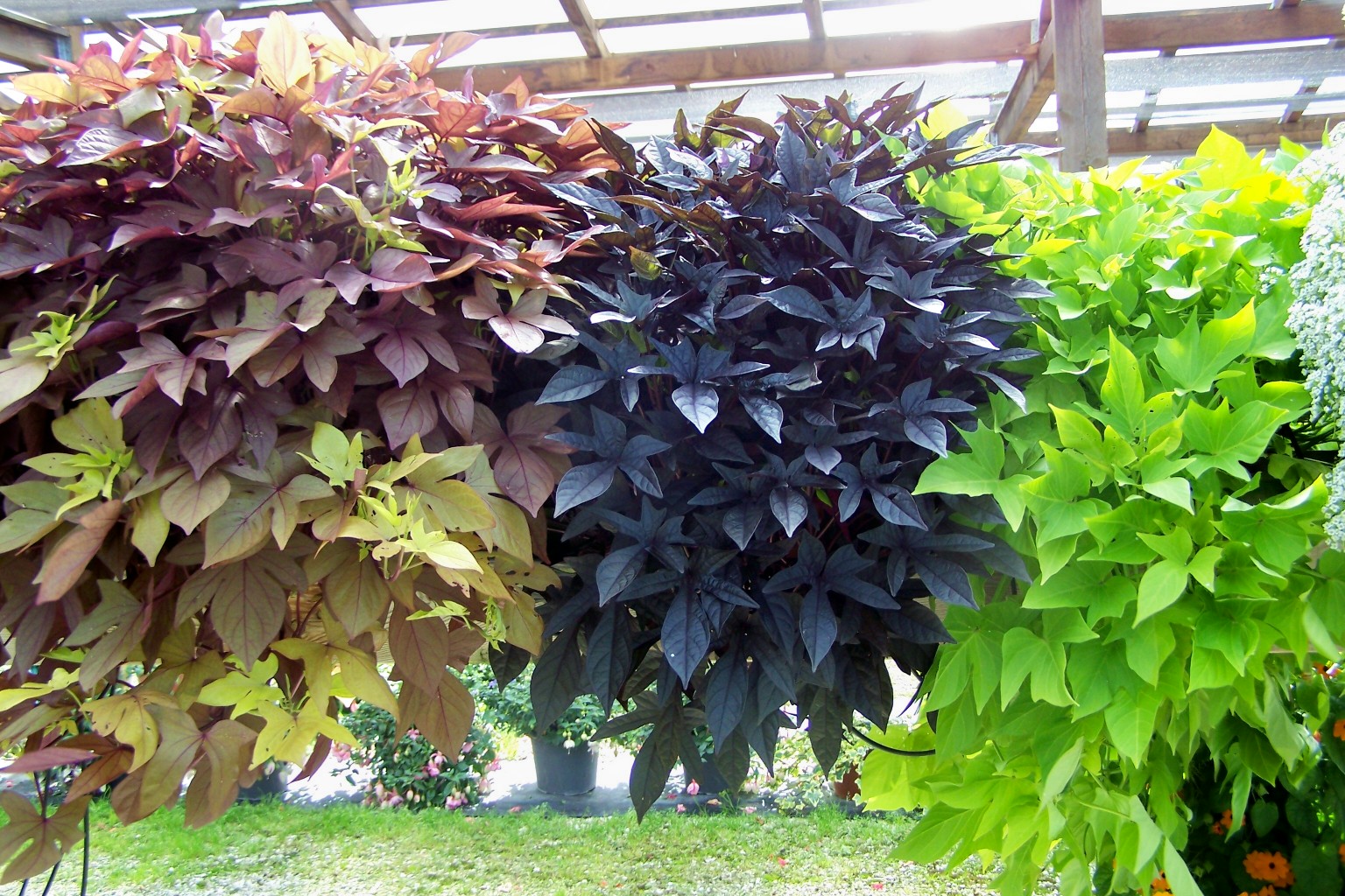 Mange moderne varianter er avlet utelukkende for det spektakulære bladverket som brukes i landskapsdesign for å dekorere bakgrunnen. Søtpotet stiger i høyden med bare 30 cm, men den vokser aktivt i horisontal retning opp til 2 m.