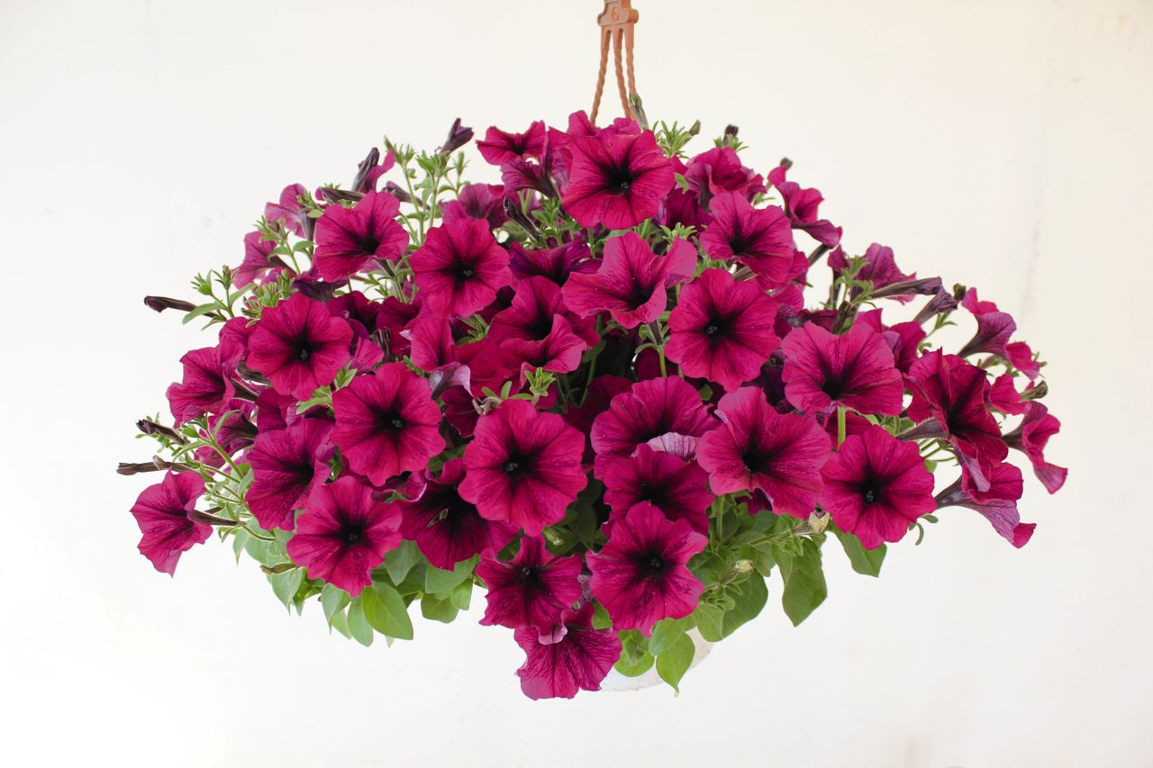 Ampel petunia tar vare på rikelig blomstring
