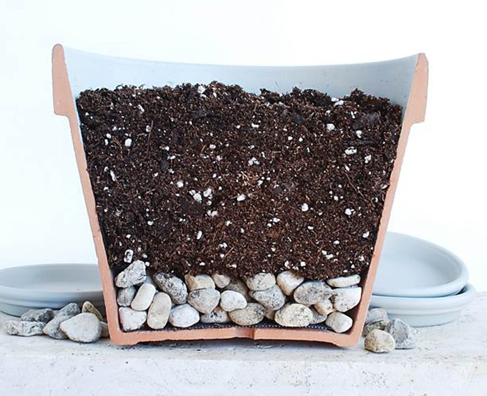 Surfinia elsker hyppig vanning, men reagerer samtidig ekstremt negativt på stillestående vann. Derfor, før du fyller potten med jord, anbefales det å legge en drenering 5 cm tykk på bunnen.