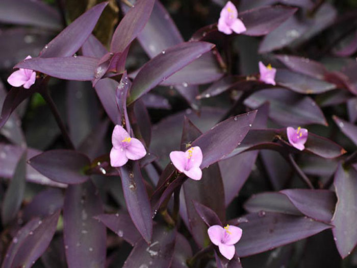 - Violet Tradescantia (setcreasia) er en plante med innkvartering av krypende stilker og avlange, spisse blader av grønn-lilla farge. Baksiden av bladet har en mer utpreget lilla farge. Bladene er pubescent. De rosa blomstene står i kontrast til det mørke bladverket.Denne arten trenger god belysning, ellers vil skuddene strekke seg ut og fargen vil falme.