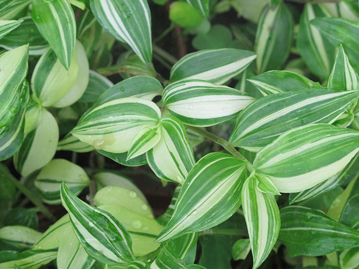- Hvitblomstret Tradescantia (hvit) passer selv i de mest skyggelagte rommene. Denne arten har lange urteaktige skudd med vekslende små blader. Bladplatene er ovale, med en skarp topp, myke og blanke. Det er varianter med lyse grønne, hvitgrønne og trefargede blader. Den blomstrer ganske sjelden, med små hvite blomster. Brukes som en rikelig plante.