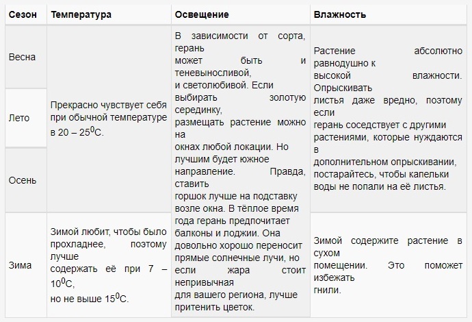 Som nevnt ovenfor liker ikke denne avlingen sprøyting, men dette betyr ikke at det ikke er nødvendig å opprettholde optimal innendørs fuktighet. Nedenfor er en tabell som viser den nødvendige luftfuktigheten og lufttemperaturen for dyrking av pelargoner.
