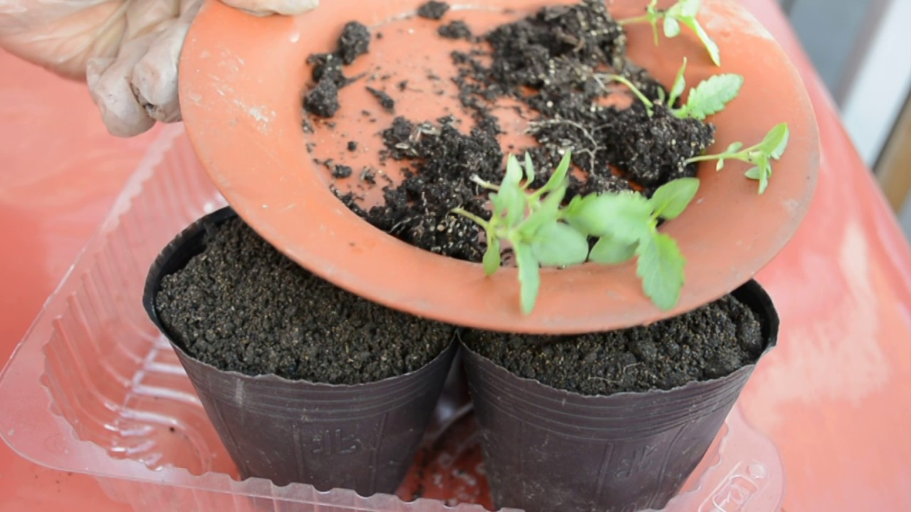 Det er lagt et dreneringslag på 2 - 3 cm tykt i bunnen av pottene. Det er bedre å plante frøplanter med jordklump for ikke å forstyrre røttene og for deres raskeste tilpasning.