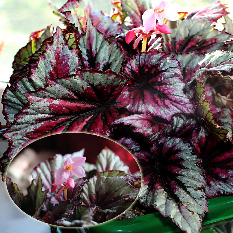 - Mason's begonia er en plante som er hjemmehørende i Ny Guinea. Fargene på bladene er interessante, hvor skinnet til et mørkebrunt maltesisk kors på en grønn bakgrunn er tydelig. Blomstene er hvit-beige, små;