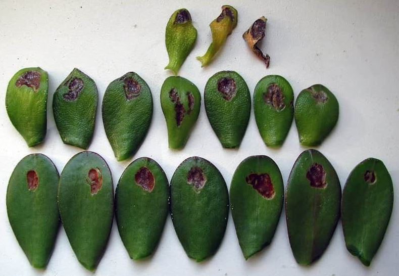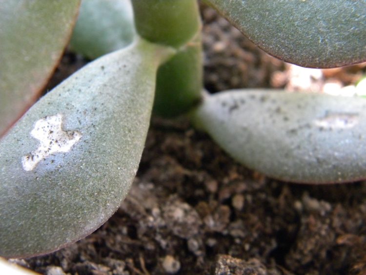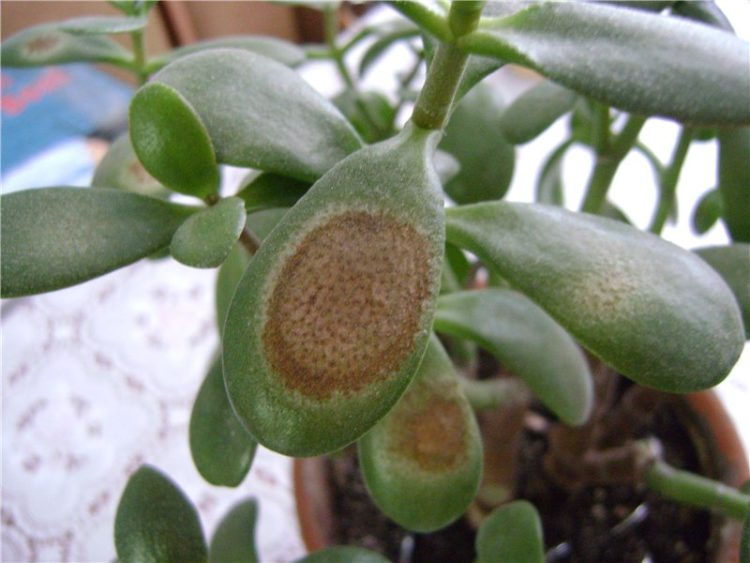 Med høy luftfuktighet blir den fete kvinnen dekket av hvite flekker, blomsteroppdretterne ser at løvverkene faller ned. Hvis du skaper behagelige forhold for kulturen (etter å ha drenert jorden og kuttet av de råtne røttene), vil små prikker snart forsvinne.