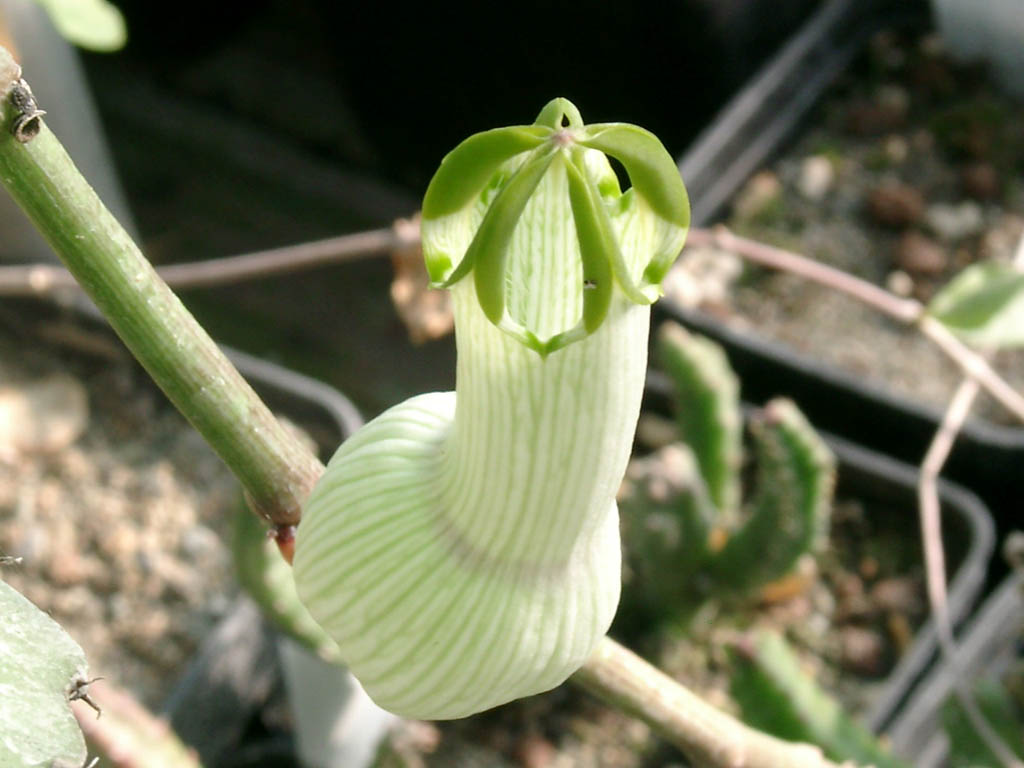 Woods ceropegia (eller, som det også kalles, Woody's ceropegia) har grå knollrøtter, som ofte overrasker nybegynnere med deres likhet med potetknoller og lilla krypende stilker.