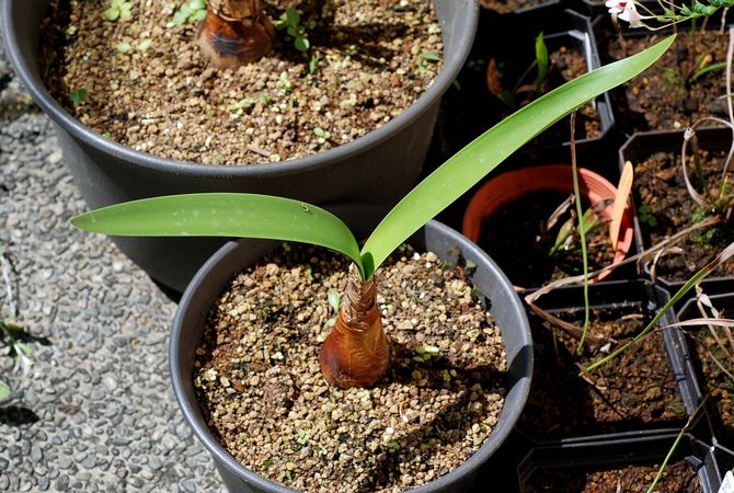 Transplantasjonen utføres hvert 2. eller 3. år, nødvendigvis om våren, og bare hvis en sterk vekst av pærene er merkbar. Under plantingsprosessen må du skille babyene fra pærene (de trenger mye næringsstoffer fra moderens pære). Det er bedre å ikke utdype halsen på pæren i bakken. Lag flere hull i gryten for å fjerne overflødig vann. Småstein og sand brukes som drenering.