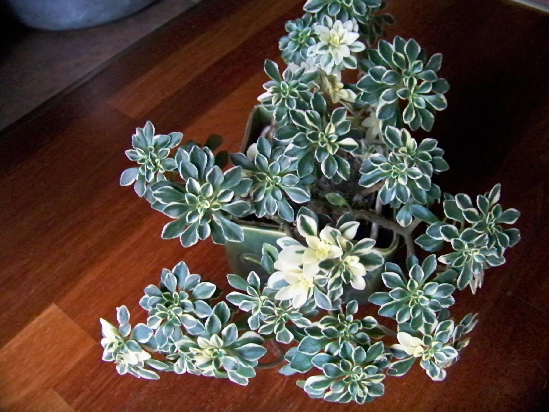 Innendørs blomst Aichryson tortuosum er en liten dekorativ busk, der diameteren på bladrosettene og prosessenes høyde er den samme - 25-30 cm.