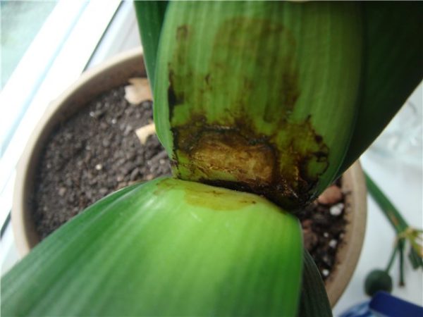 Råtnende eller brune formasjoner på tuppen av bladene indikerer skade på røttene under transplantasjon eller overflødig fuktighet.