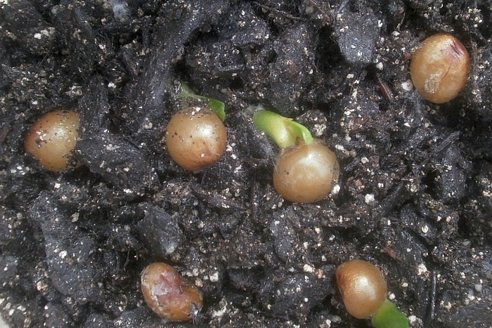 - 2) Så det hovne frøet i en avstand på 2 cm i torv-perlit-blandingen. Perlit kan erstattes med sand eller torv.
