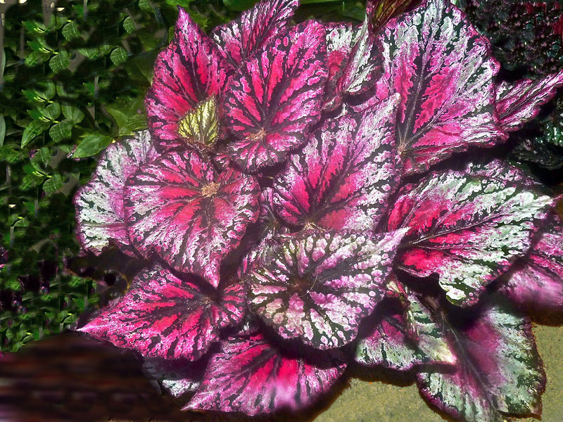 - kongelig begonia. Dette er en av de grønne begoniahybridene, ikke vokst for å beundre de frodige blomstene, men for å nyte det uvanlige, flekkete løvet hele året.Bladelen har en asymmetrisk form og når en lengde på opptil 15 cm. Tegningen er alltid lys, og representerer et komplekst mønster av grønne, lilla, sølv og burgunderfarger. Royal begonia er en veldig lunefull plante som trenger ekstra oppmerksomhet;