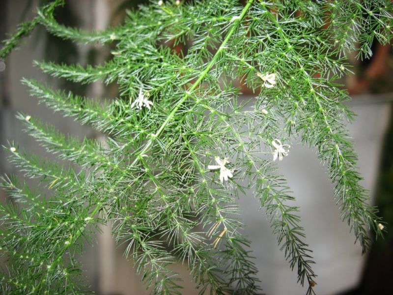 Asparges plumosus, eller pinnate (Asparagus plumosus) - eviggrønn flerårig plante, tilhører aspargesfamilien. Har en tett krone med mange tynne forgrenede skudd. Løvverk gir en spesiell dekorativ effekt, små plater reduseres og uttrykkes i skalaer. På grunn av sitt uvanlige utseende blir asparges populært kalt "edderkoppnett".