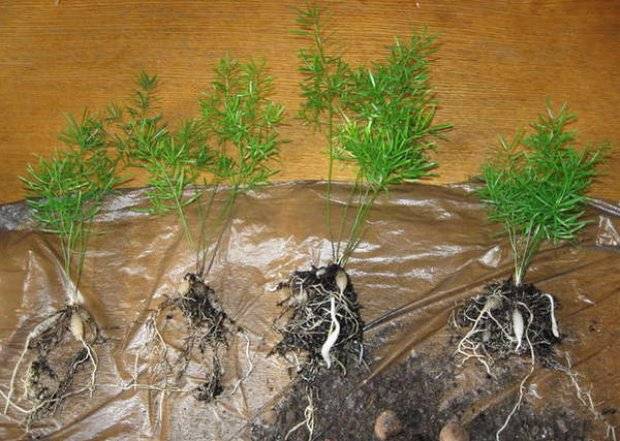Asparges kan forplantes ved å dele moderbusken. Prosedyren utføres med nødvendig plantetransplantasjon. Ta asparges ut av gryten og del den forsiktig i flere like store deler, som hver er plantet i separate beholdere.