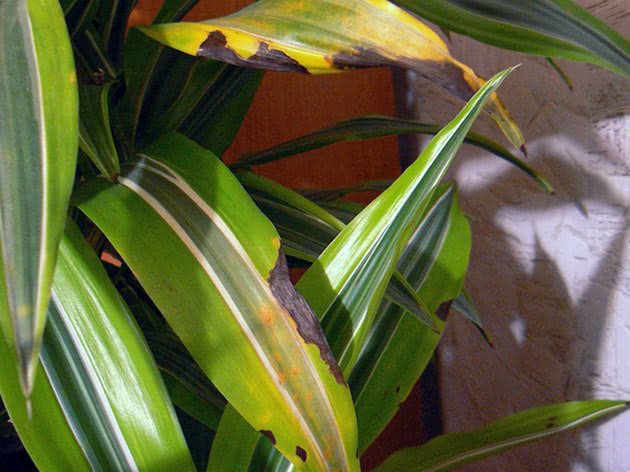 - Spissen av bladene tørker ut eller de blir bleke. Dette er en konsekvens av høy luftfuktighet og høy temperatur i rommet, samt mangel på belysning.