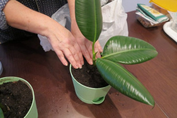 Tidlig høst er tiden for transplantasjon av ficus. Først tilberedes en romslig gryte som skal være i delvis skygge. Jorda er utviklet og vannet rikelig. Etter å ha transplantert en blomst, er toppen av jorden dekket av et materiale som holder på fuktigheten. Vanning utføres om morgenen eller sent på kvelden. På dagtid blir ikke pottene vannet. Vann fordamper veldig raskt, uten å ha tid til å trenge gjennom jorden. Det vil ikke være noen fordel med vanning på dagtid. Om høsten blir de matet med gjødsel.