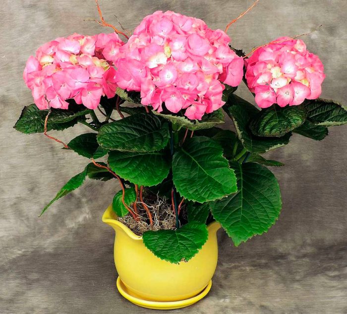 Blomstringene ligner en ball. Fargen deres avhenger av jordens surhetsgrad og kan variere fra hvite til mørke lilla nyanser. Blomstrer fra juni til august. Om vinteren kan den bare blomstre i lukkede drivhus.