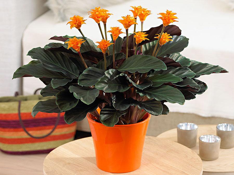 Calathea blomster har en lys gul, rik oransje farge. De er små i størrelse, men deres uvanlige utseende tilfører planten dekorativitet.
