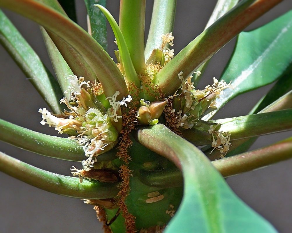 Euphorbia tilhører familien Euphorbia. Det er andre navn på denne planten - apepalme og euphorbia.