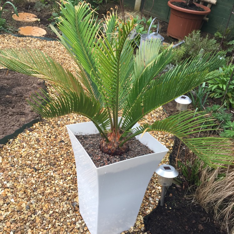 Fra basen av kofferten, kalt caudex, vokser fjærete blader 80-100 centimeter lange. I midten av planten dannes kjegleformede blomster av gylden farge. Cycas revoluta kan vokse i 100 år.