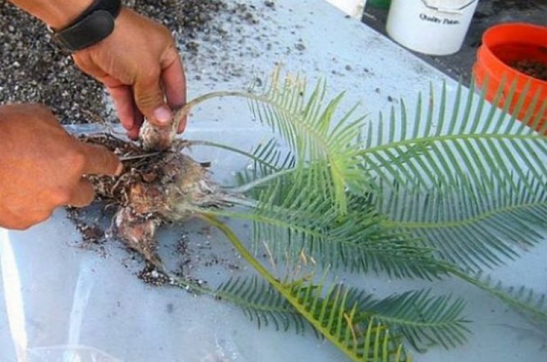 Hvis jorden er for våt, kan rotsystemet til blomsten begynne å råtne. For å kvitte seg med problemet, må planten fjernes fra potten, kutte delene som er berørt av råte, spray sprayen med et soppdrepende middel. Etter det blir cicas transplantert i en desinfisert krukke med ny jord.