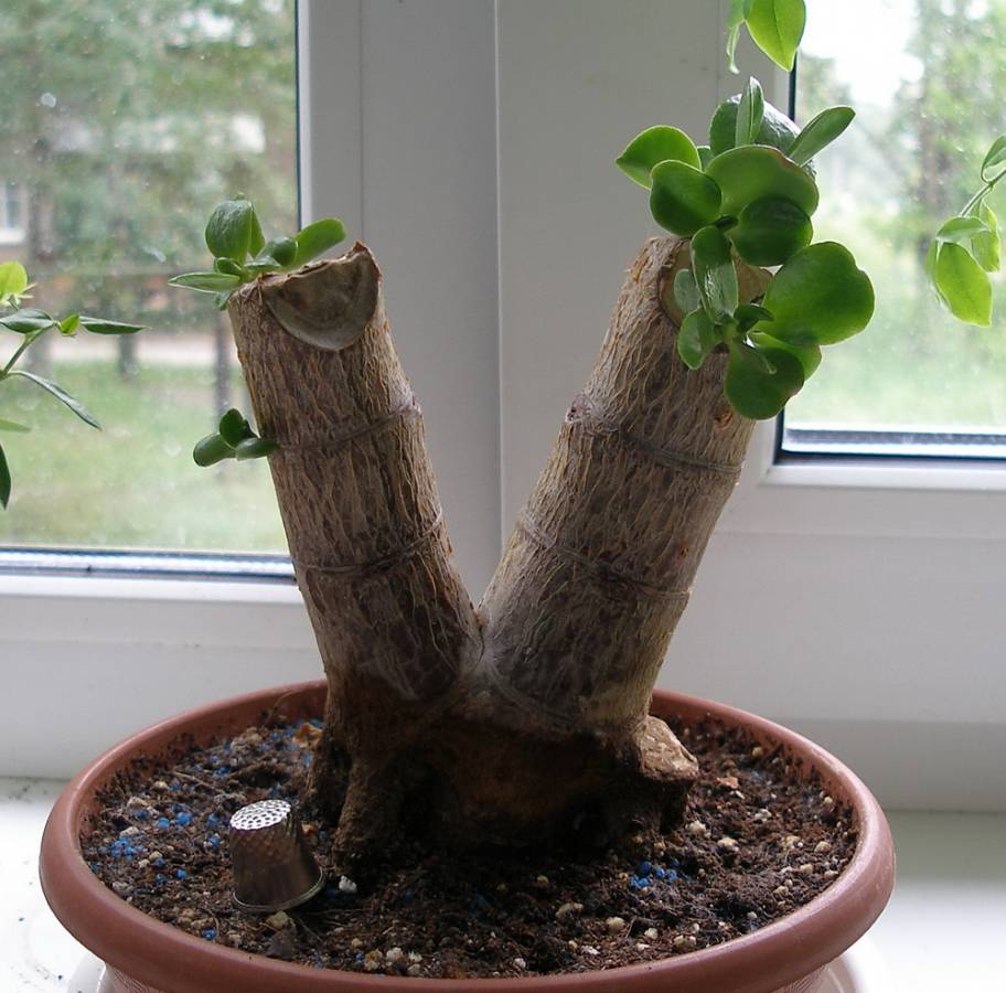 Et ungt individ vil lykkes med å gjøre stammen bred; en voksen kultur egner seg ikke godt til slike manipulasjoner. En tykk koffert oppnås ved å dyrke lange grener. Lange skudd har sterke baser. Etter at stammen er satt med tilstrekkelig tykkelse, fjernes lengden. Blader i bunnen av kofferten fjernes også. Seksjonene er behandlet med kull og aske. Avstanden mellom jorda og de kappede grenene skal være liten, du kan legge til jord. Den saftige vil gi flere røtter og begynner å tykne i stammen.