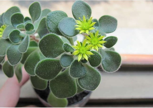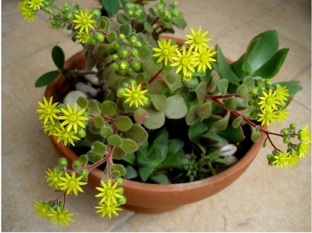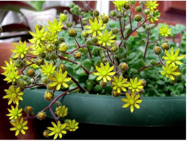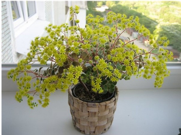 Hvis du bryr deg om busken riktig, kan du få en spredning av lyse gule blomster hjemme. Blomstrende aichrizon på vinduskarmen vil glede folket som passerer vinduet.
