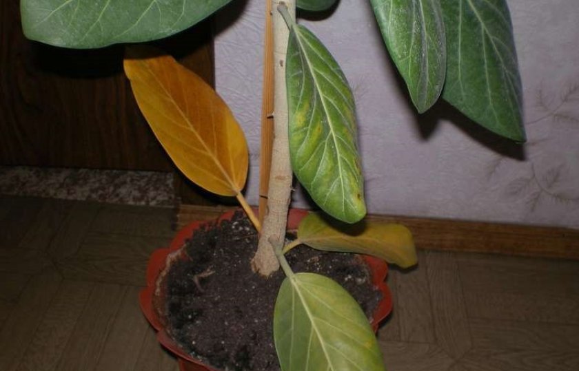Årsaken til å kaste løvverk er lav luftfuktighet. I dette tilfellet blir de også gule. Bladene bør tørkes av og sprayes oftere. En beholder med våt ekspandert leire plasseres ved siden av.
