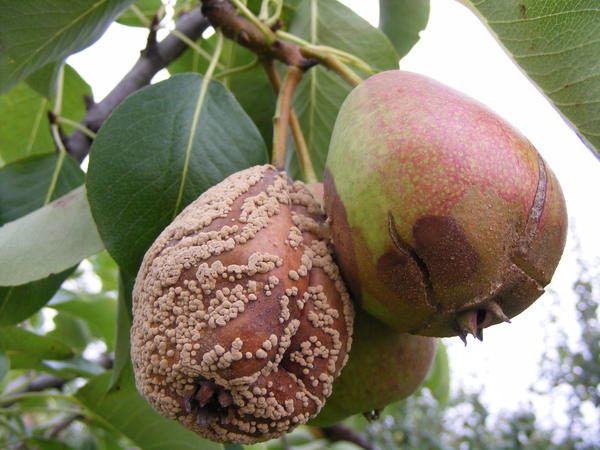 Hvordan en syk pære ser ut: symptomer vises med oppvarming, en dyp hvit blomst vises på løvet. Når grøntområdet vokser, endres fargen til rød. Behandling innebærer behandling med "Sulfite" eller "Fundazol".