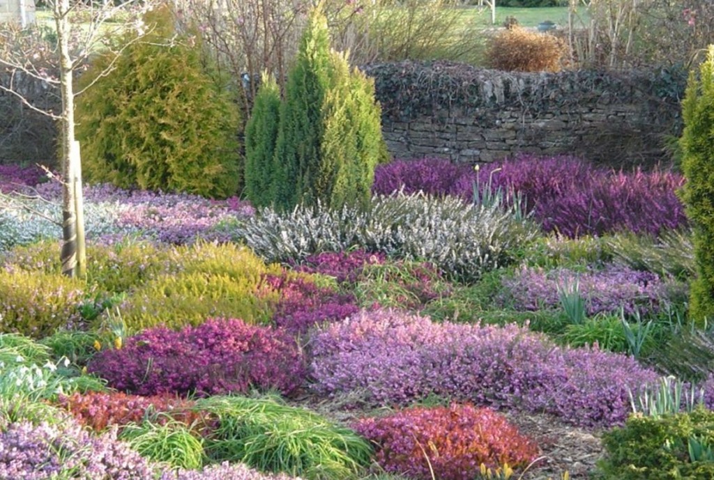 - Urteaktige nelliker er representert av omfattende grønne og gråblå tepper, dekorert med rosa, hvite, røde blomster i steinhager og blomsterbed.