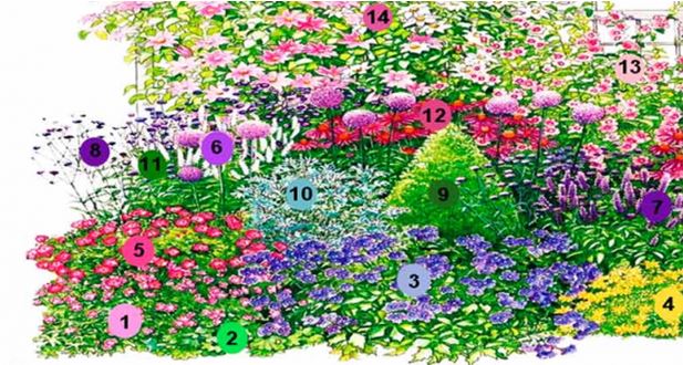 Deretter grupperes plantene. Hybrid, frodig, kileformet, panikulær, moskusflora plantes under nummer 5, 6, 7, 8 og 9. Cirrusfedd (10) vil gi sarte farger og en spesiell aroma til busker. Steinerosen (11) blir høydepunktet av blomsterbedet, Thunberg-bærbæren (2) - en elegant kant.
