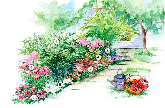 Raffinert jasmin blir skjelettbusk av mixborder (1). Peonies (2) og floxes (3) vil spres på høyre og venstre side. Lilies (4) og Houston Ageratum (5) vil gi mellomlaget av mellomstore avlinger. Blant lave planter for å lage en grense, vil sjølobularia (7), tyrkisk nellike (8) være et akseptabelt alternativ.