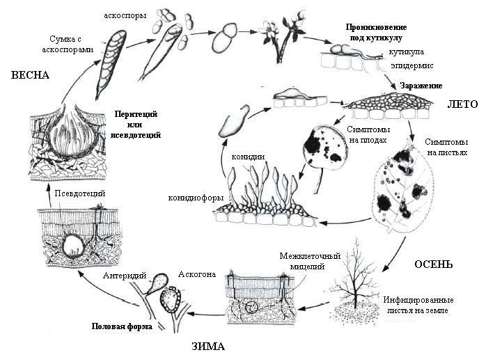 Soppinfeksjon (på latin Venturia inaequalis) påvirker ungt løvverk, påvirker frukting. Sykdommen sprer seg sakte og umerkelig, derfor blir den ikke lagt merke til umiddelbart av eieren av eplehagen. De primære tegnene registreres ved slutten av blomstringen: gulgrønne flekker dannes på løvet, en gråaktig blomst er synlig på noen. Gradvis blir de svarte, fanger det meste av bladplaten og migrerer til frukt.