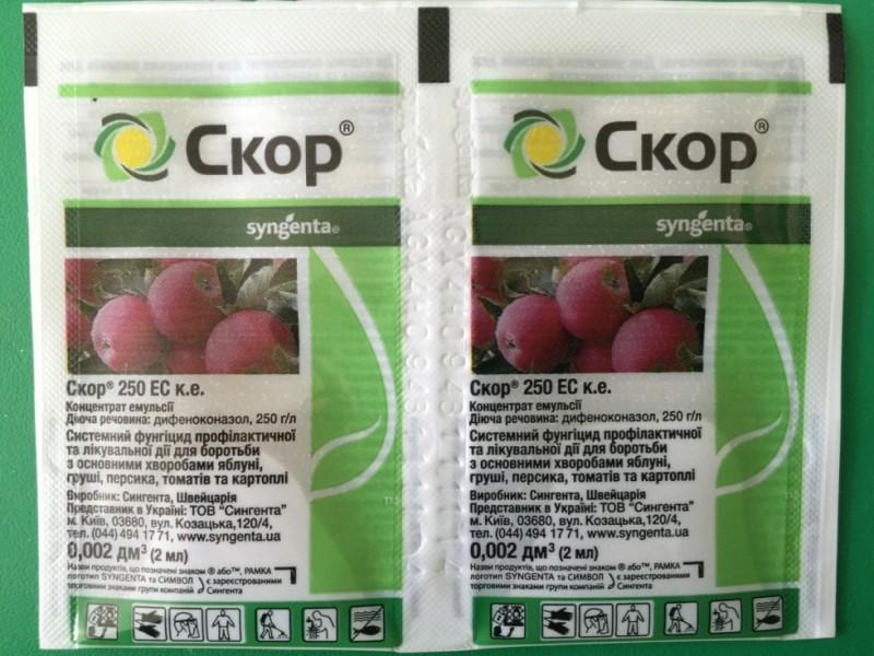 Henviser til antibiotika med et systemisk og kontaktspekter av handling, hver kultur krever 5 liter oppløsning (20 ml per 10 liter væske). Ved behandling opprettholder de et intervall på 15 dager, i løpet av sesongen trenger de å spraye hagen 4 ganger.