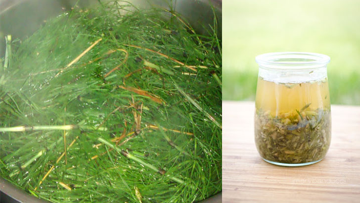 - Infusjon av hestehale. Finhakkede greener helles med vann (1 til 3), tett lukket og insisterte i tre dager. Etter filtrering med det ferdige stoffet, må du spraye den grønne delen og kofferten.
