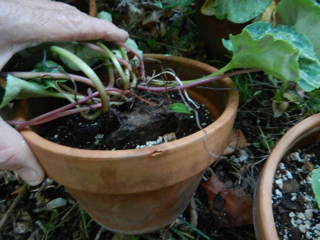 Du kan finne ut årsaken til mangelen på blomstring av cyklamen ved å undersøke den plantede knollen nøye i en gryte. Hvis den er helt nedgravd i bakken, kan blomstre ikke forventes. Knollen skal stikke ut fra bakken med en tredjedel.